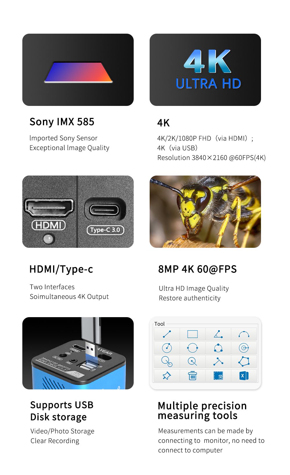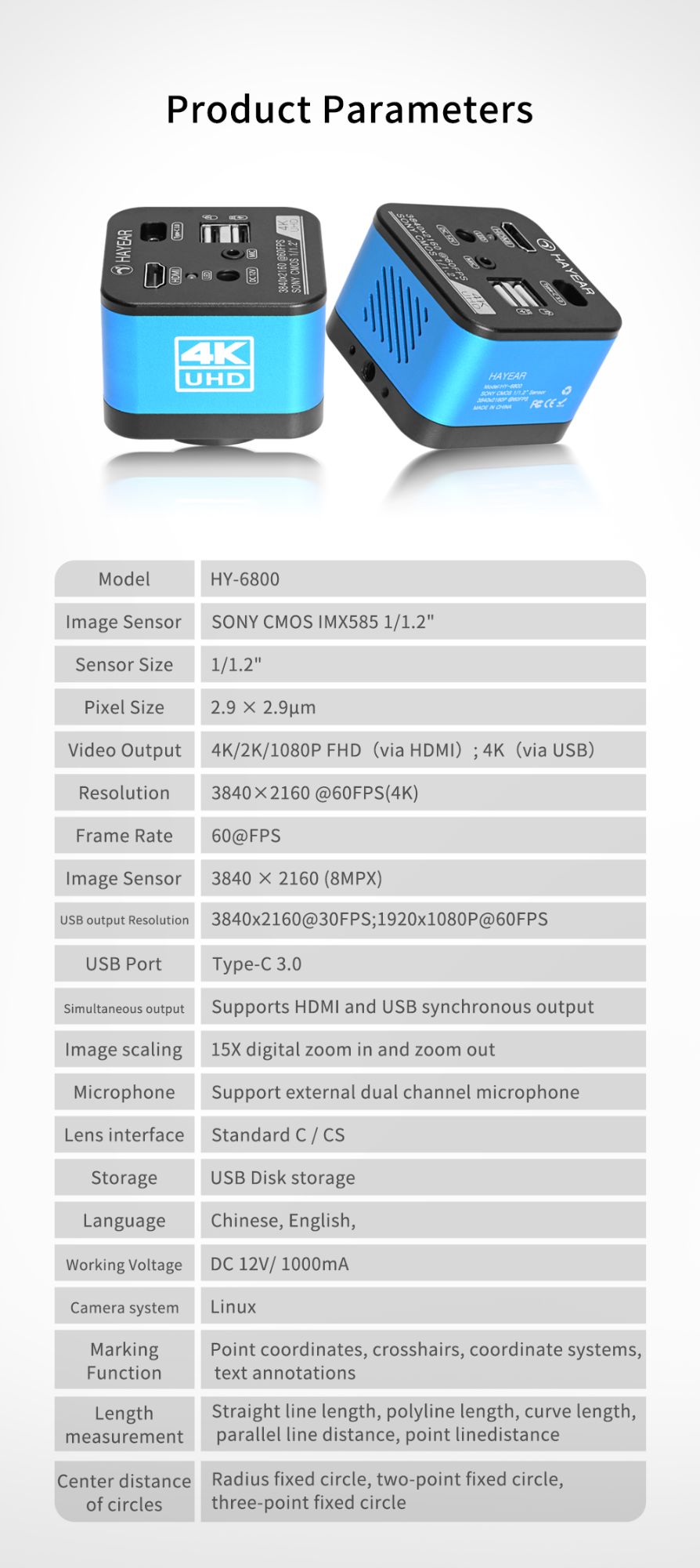 USB output Resolution | 3840x2160@30FPS;1920x1080P@60FPS |